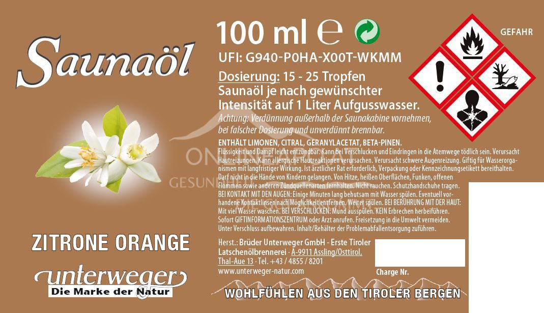 Experience pure refreshment with Unterweger Lemon Orange sauna oil. The tangy, naturally pure fragrance of lemon and orange invigorates body and mind, increases well-being and transforms every sauna session into a revitalising fruit experience