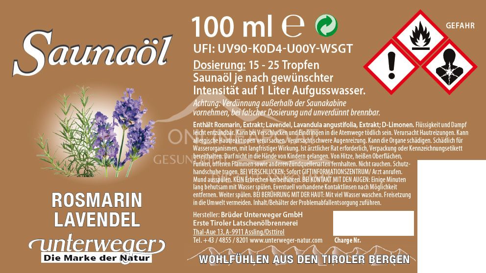 Re-energise with the Rosemary Lavender sauna oil from Unterweger. The stimulating power of rosemary promotes blood circulation, while lavender relieves tension. Ideal for regeneration after sport and for a revitalising sauna ritual.