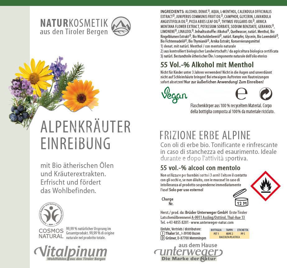 Treat your body to pure nature! The vegan Unterweger Vitalpinum Alpine Herb Rub with valuable organic herbal extracts provides new energy, refreshes and promotes well-being. Apply to stressed areas of the body and enjoy.