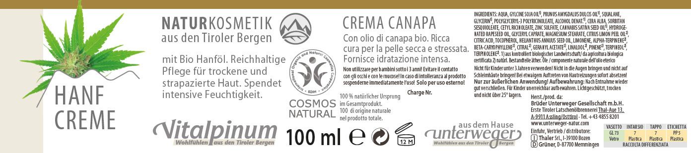 Die Unterweger Vitalpinum Hanf Creme nutzt die wertvollen Fettsäuren des Hanfsamenöls zur Pflege beanspruchter Hautstellen. Sie unterstützt die natürliche Schutzbarriere und sorgt für ein geschmeidiges Hautgefühl nach der Anwendung.