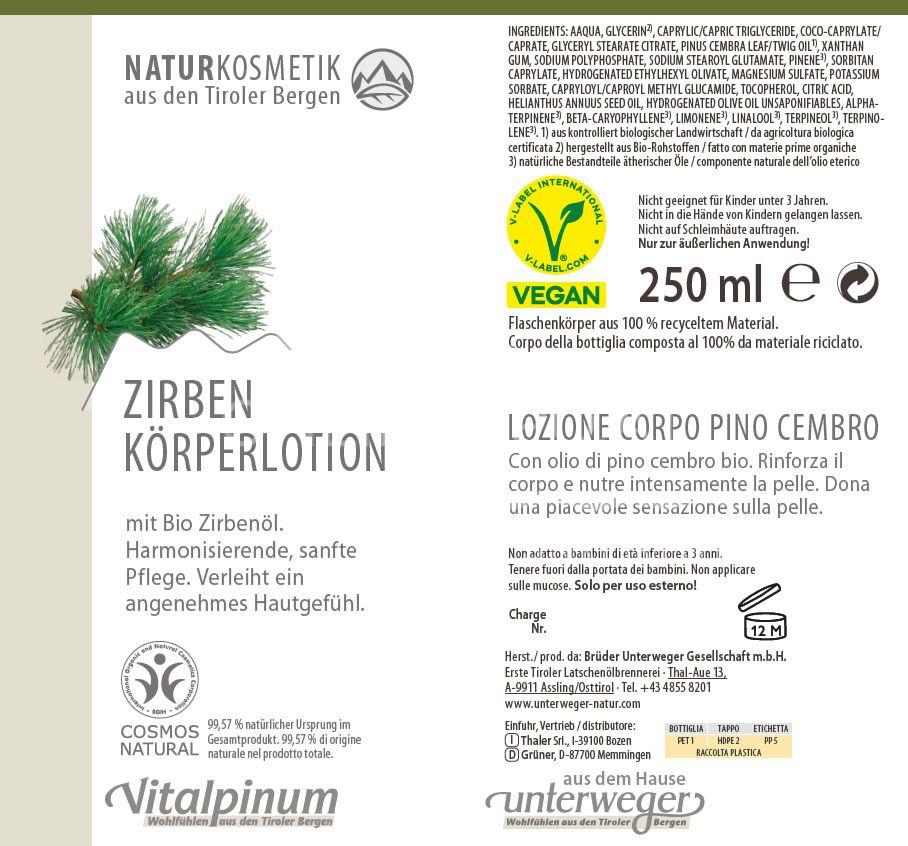 Ingredients: AQUA, LAURYL GLUCOSIDE, SODIUM COCO-SULFATE, PINUS CEMBRA LEAF/TWIG OIL¹⁾, SODIUM CHLORIDE, COCOYL METHYL GLUCAMIDE, PINENE²⁾, SORBITAN CAPRYLATE, CITRIC ACID, POTASSIUM SORBATE, CAPRYLOYL/CAPROYL METHYL GLUCAMIDE, TOCOPHEROL, HELIANTHUS ANNUUS SEED OIL, ALPHA-TERPINENE²⁾, BETA-CARYOPHYLLENE²⁾, LIMONENE²⁾, TERPINEOL²⁾, TERPINOLENE²⁾. ¹⁾from certified organic farming / da agricoltura biologica certificata. ²⁾natural components of essential oils. Öle / componenti naturali dell'olio etereo.