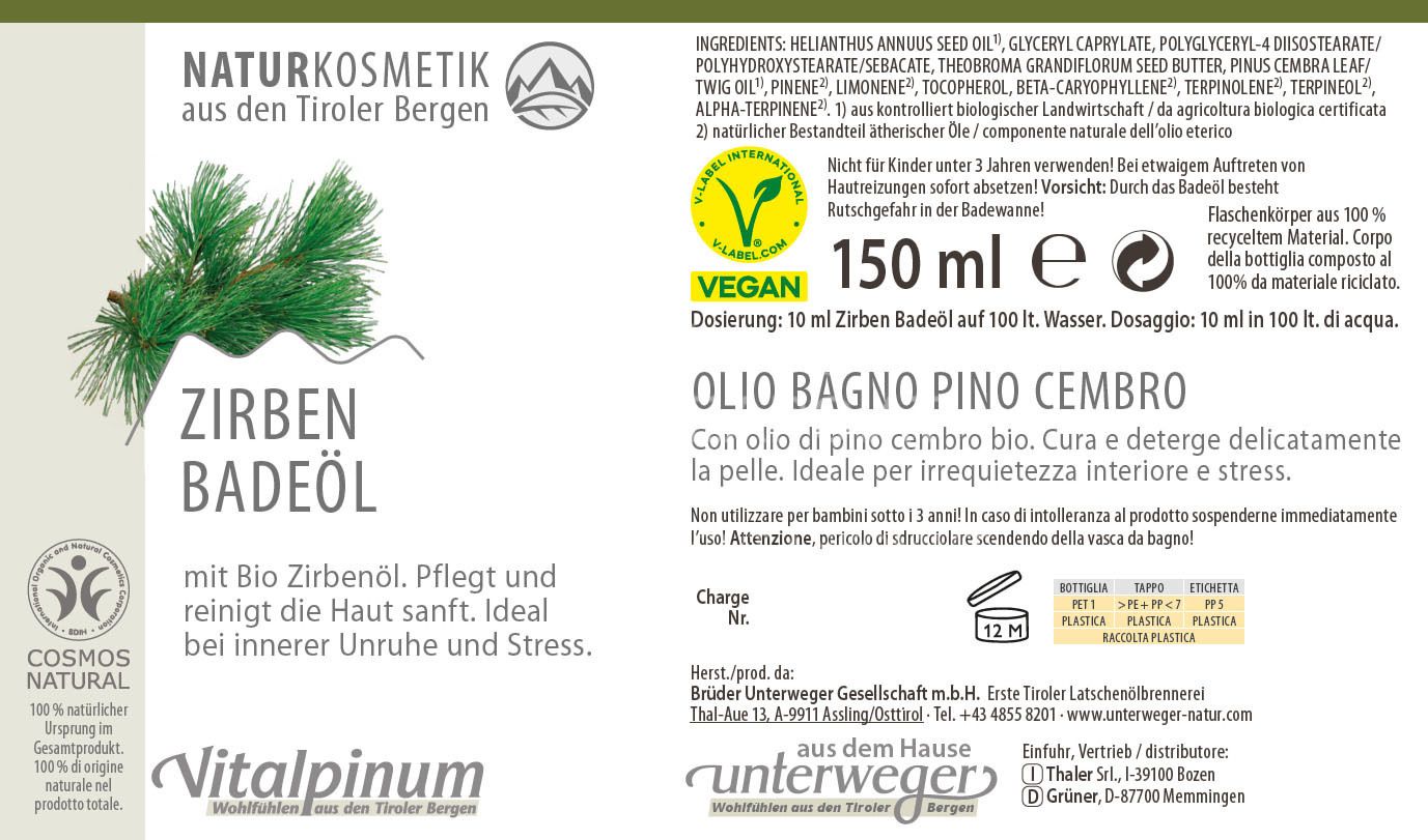 Ingredients: AQUA, LAURYL GLUCOSIDE, SODIUM COCO-SULFATE, PINUS CEMBRA LEAF/TWIG OIL¹⁾, SODIUM CHLORIDE, COCOYL METHYL GLUCAMIDE, PINENE²⁾, SORBITAN CAPRYLATE, CITRIC ACID, POTASSIUM SORBATE, CAPRYLOYL/CAPROYL METHYL GLUCAMIDE, TOCOPHEROL, HELIANTHUS ANNUUS SEED OIL, ALPHA-TERPINENE²⁾, BETA-CARYOPHYLLENE²⁾, LIMONENE²⁾, TERPINEOL²⁾, TERPINOLENE²⁾. ¹⁾from certified organic farming / da agricoltura biologica certificata. ²⁾natural components of essential oils. Öle / componenti naturali dell'olio etereo.