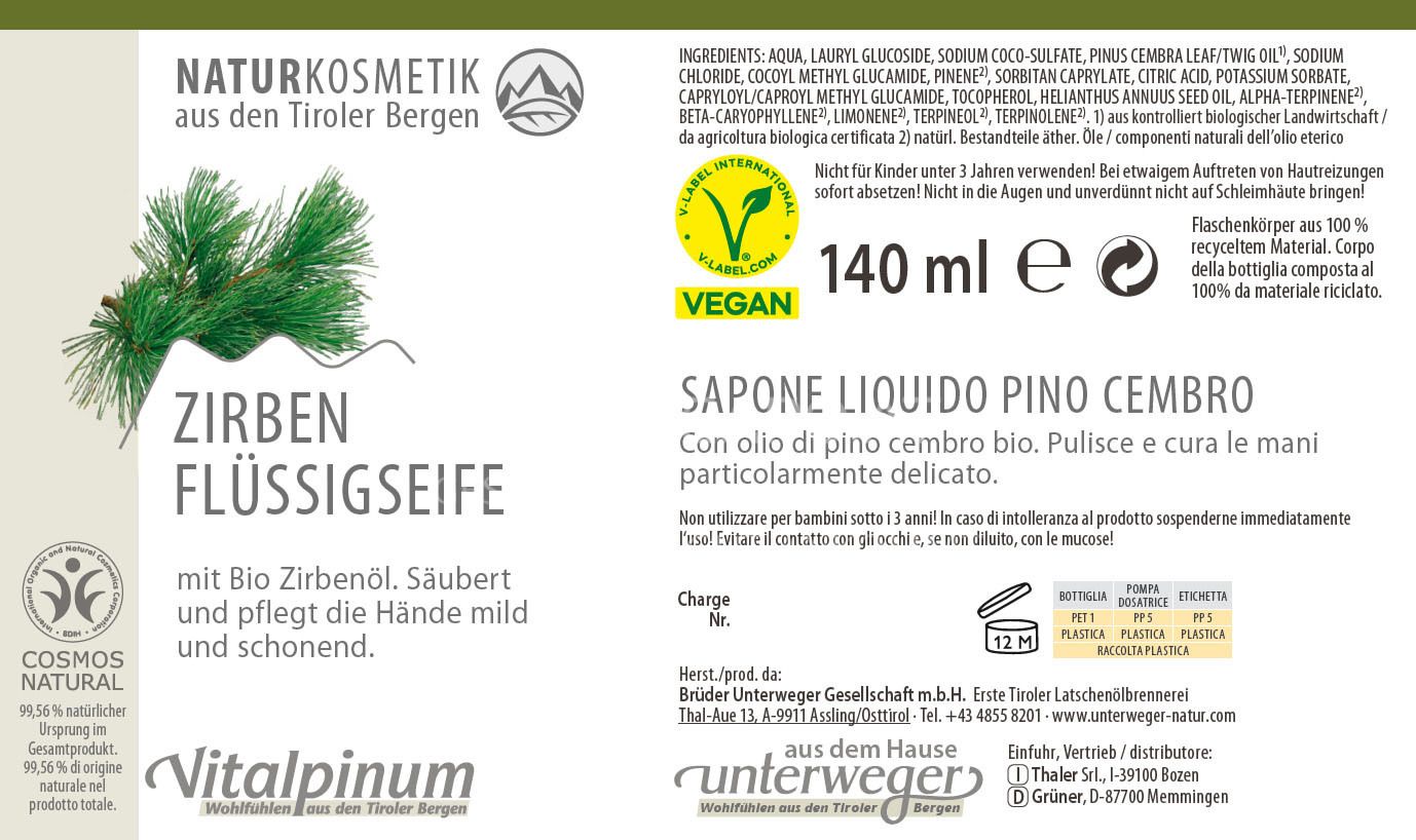 Ingredients: AQUA, LAURYL GLUCOSIDE, SODIUM COCO-SULFATE, PINUS CEMBRA LEAF/TWIG OIL¹⁾, SODIUM CHLORIDE, COCOYL METHYL GLUCAMIDE, PINENE²⁾, SORBITAN CAPRYLATE, CITRIC ACID, POTASSIUM SORBATE, CAPRYLOYL/CAPROYL METHYL GLUCAMIDE, TOCOPHEROL, HELIANTHUS ANNUUS SEED OIL, ALPHA-TERPINENE²⁾, BETA-CARYOPHYLLENE²⁾, LIMONENE²⁾, TERPINEOL²⁾, TERPINOLENE²⁾. ¹⁾from certified organic farming / da agricoltura biologica certificata. ²⁾natural components of essential oils. Öle / componenti naturali dell'olio etereo.