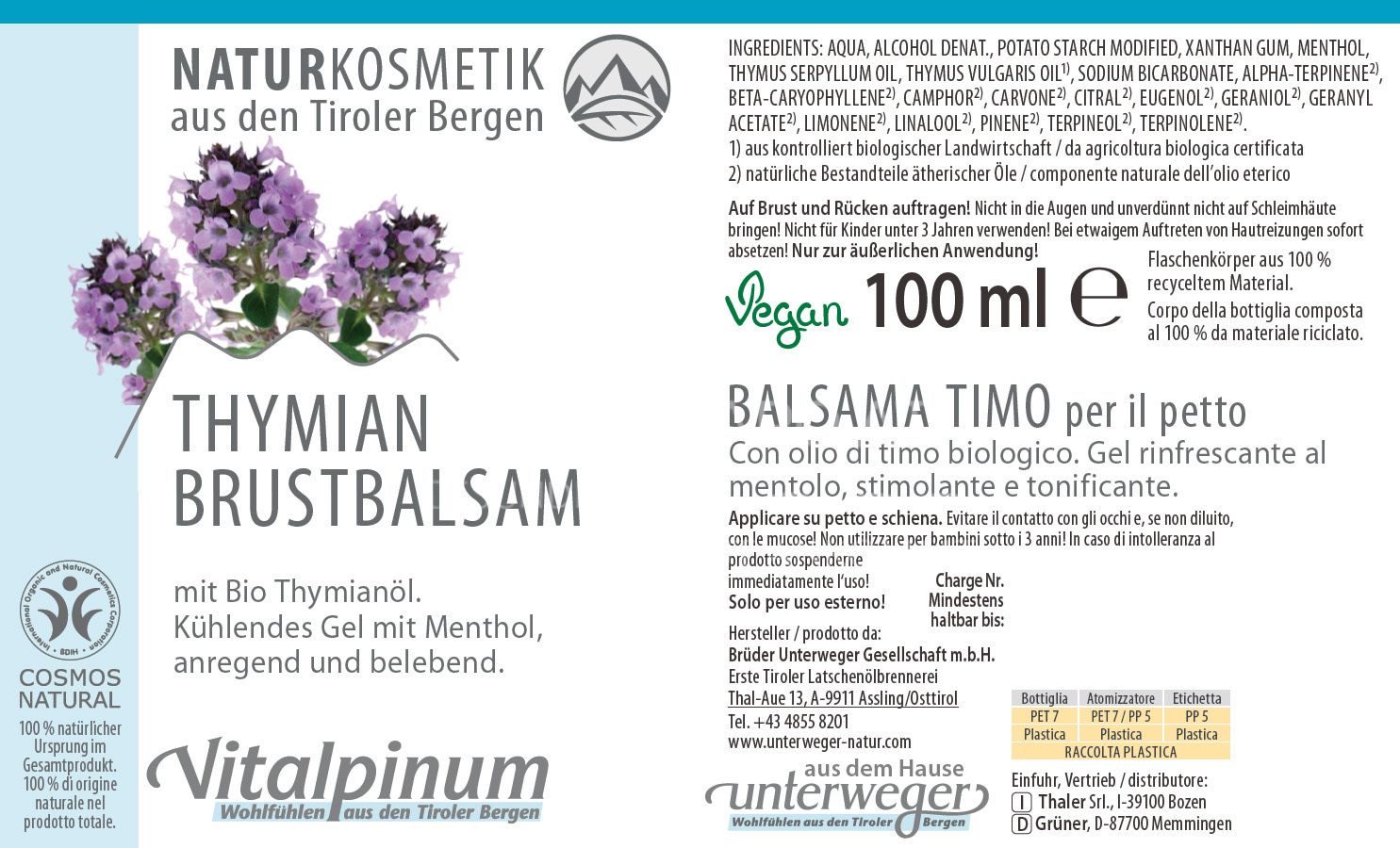 Zusammensetzung: AQUA, ALCOHOL DENAT., POTATO STARCH MODIFIED, XANTHAN GUM, MENTHOL, THYMUS SERPYLLUM OIL, THYMUS VULGARIS OIL¹⁾, SODIUM BICARBONATE, ALPHA-TERPINENE²⁾, BETA-CARYOPHYLLENE²⁾, CAMPHOR²⁾, CARVONE²⁾, CITRAL²⁾, EUGENOL²⁾, GERANIOL²⁾, GERANYL ACETATE²⁾, LIMONENE²⁾, LINALOOL²⁾, PINENE²⁾, TERPINEOL²⁾, TERPINOLENE²⁾.¹⁾ aus kontrolliert biologischer Landwirtschaft / da agricoltura biologica certificata ²⁾ natürliche Bestandteile ätherischer Öle / componente naturale dell'olio etereo.