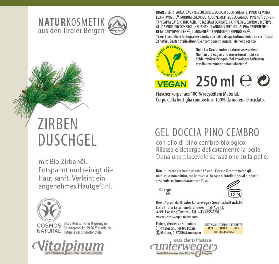 Genießen Sie mit dem Unterweger Vitalpinum Zirben Duschgel den wohltuenden Duft der Alpen. Das enthaltene Zirbenöl wirkt beruhigend und schenkt Ihnen einen Moment der Entspannung bei der täglichen Dusche.