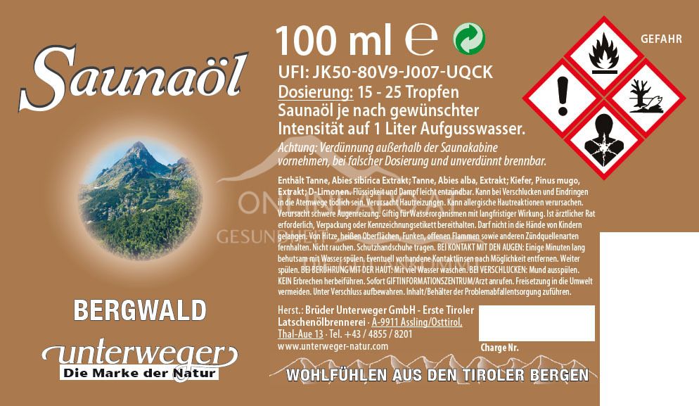 Experience an infusion like a refreshing walk in the forest with Unterweger mountain forest sauna oil. High-quality, pure essential oils from conifers revitalise body and soul and bring the unadulterated power of nature into your sauna.