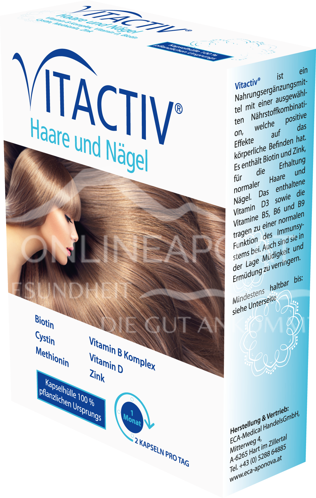 Vitactiv® Hair and Nails Capsules are a dietary supplement for the normal function of hair and nails. For beautiful, full hair and strong nails, with biotin, cystine, methionine, vitamin B complex, vitamin D and zinc.