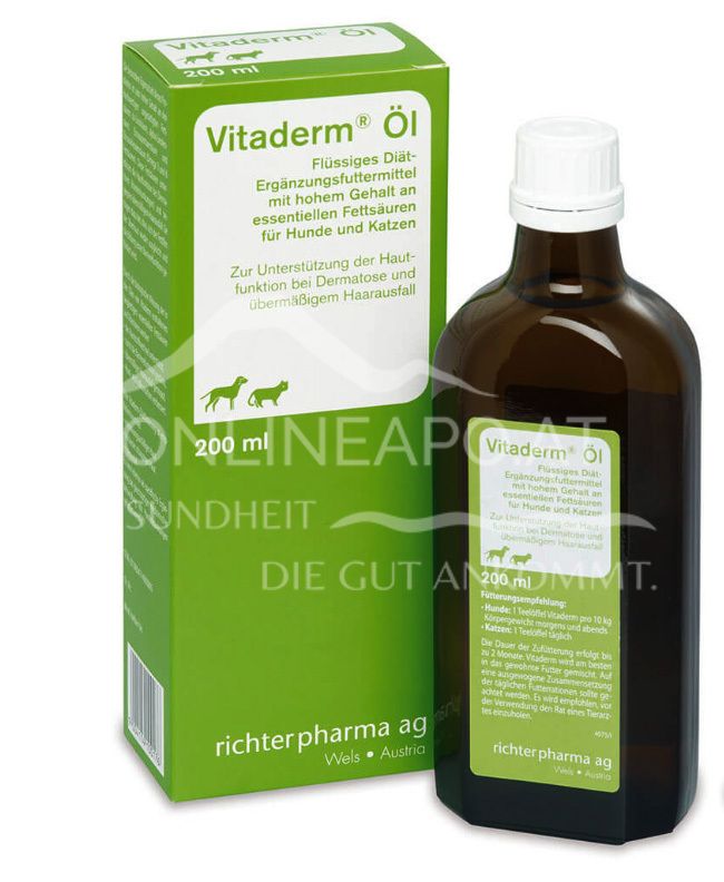 Vitaderm® Öl ist ein flüssiges Diät-Ergänzungsfuttermittel mit hohem Gehalt an essentiellen Fettsäuren für Hunde und Katzen. Zur Unterstützung der Hautfunktion bei Dermatose und übermäßigen Haarausfall.