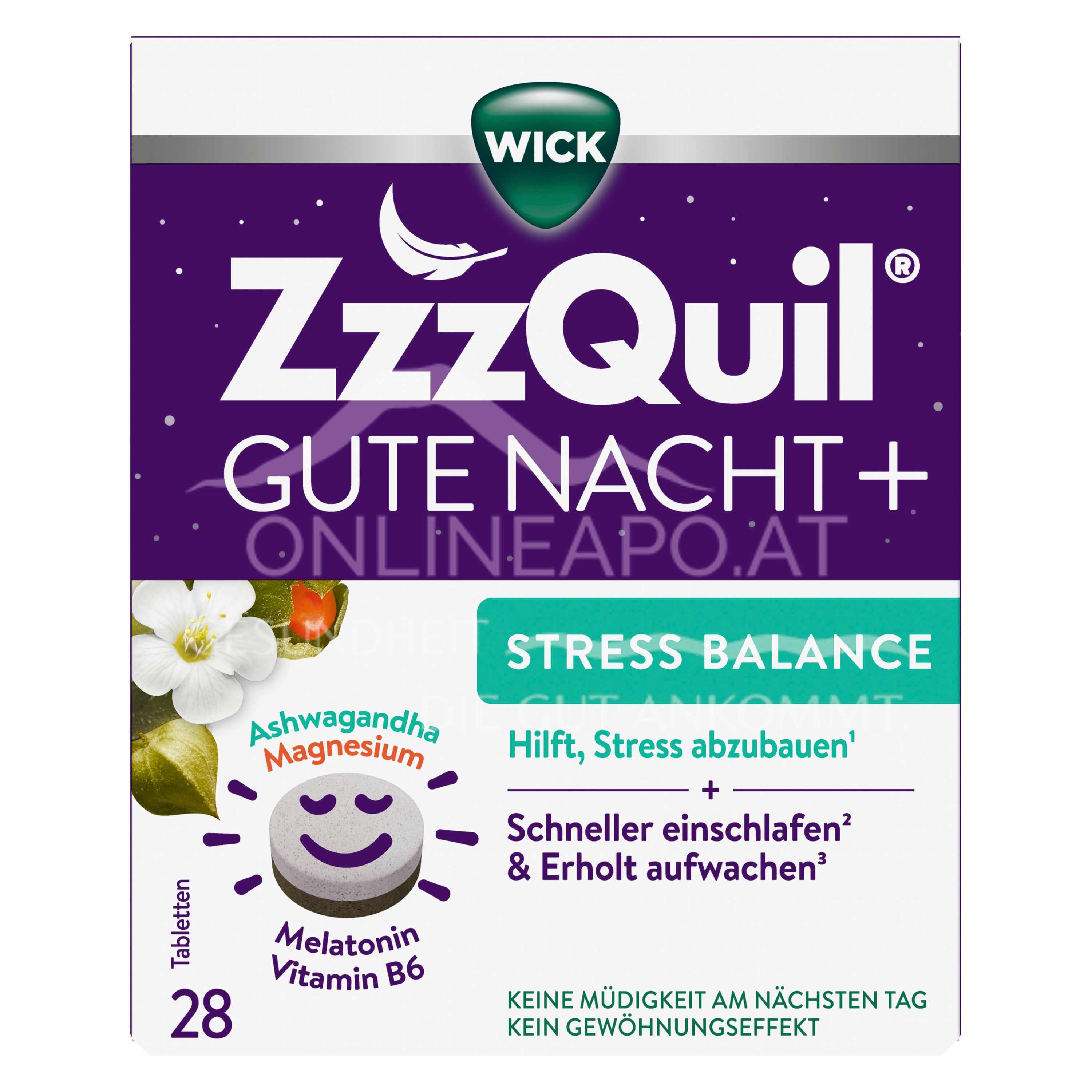 Entdecken Sie WICK ZzzQuil® Gute Nacht + Stress Balance. Die innovative Tablette mit Melatonin, Baldrian & Ashwagandha fördert das Einschlafen und stärkt die Nerven. Hochwertige Pflanzenextrakte für eine erholsame Nacht ohne Hangover am Morgen.