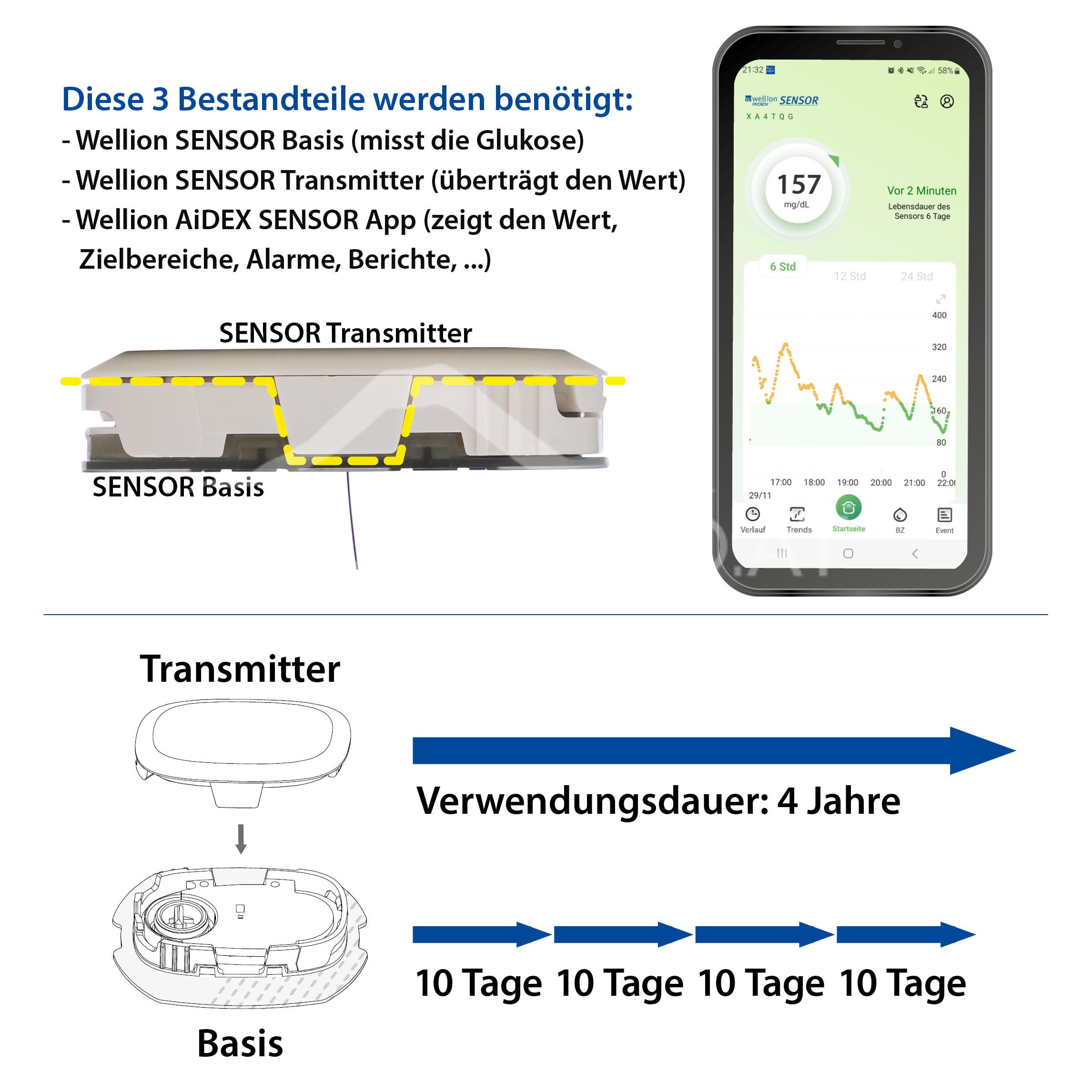 - Wellion AiDEX SENSOR App: The app receives the measured values from the transmitter and is used to read out the data. The app is available for Android and iOS.