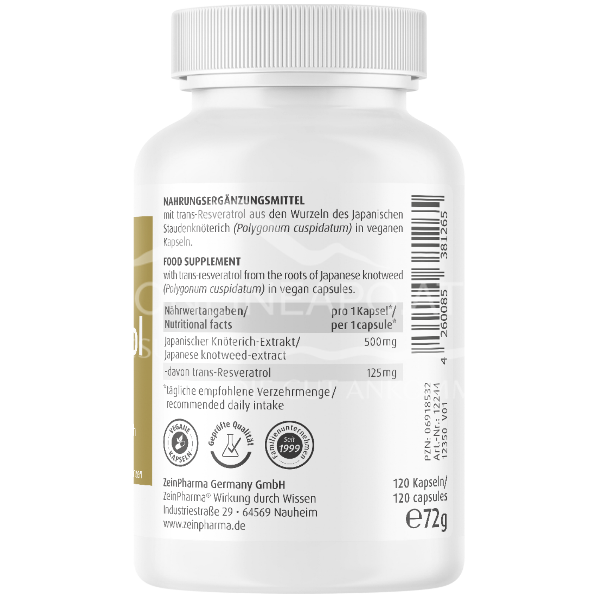 ZeinPharma Resveratrol 125 mg capsules are a food supplement with resveratrol from the roots of Japanese knotweed (Polygonum cupsidarum) in vegetarian capsules.