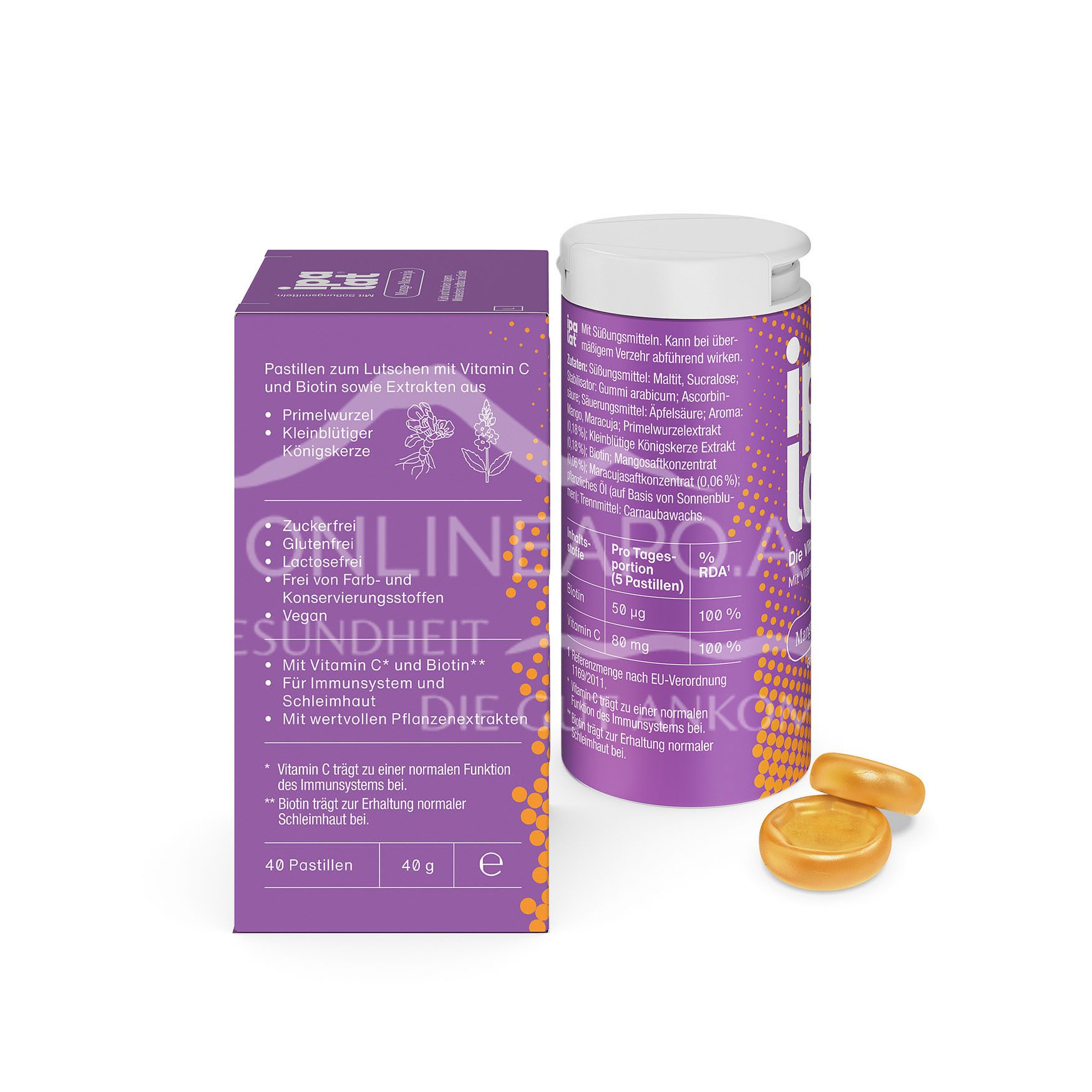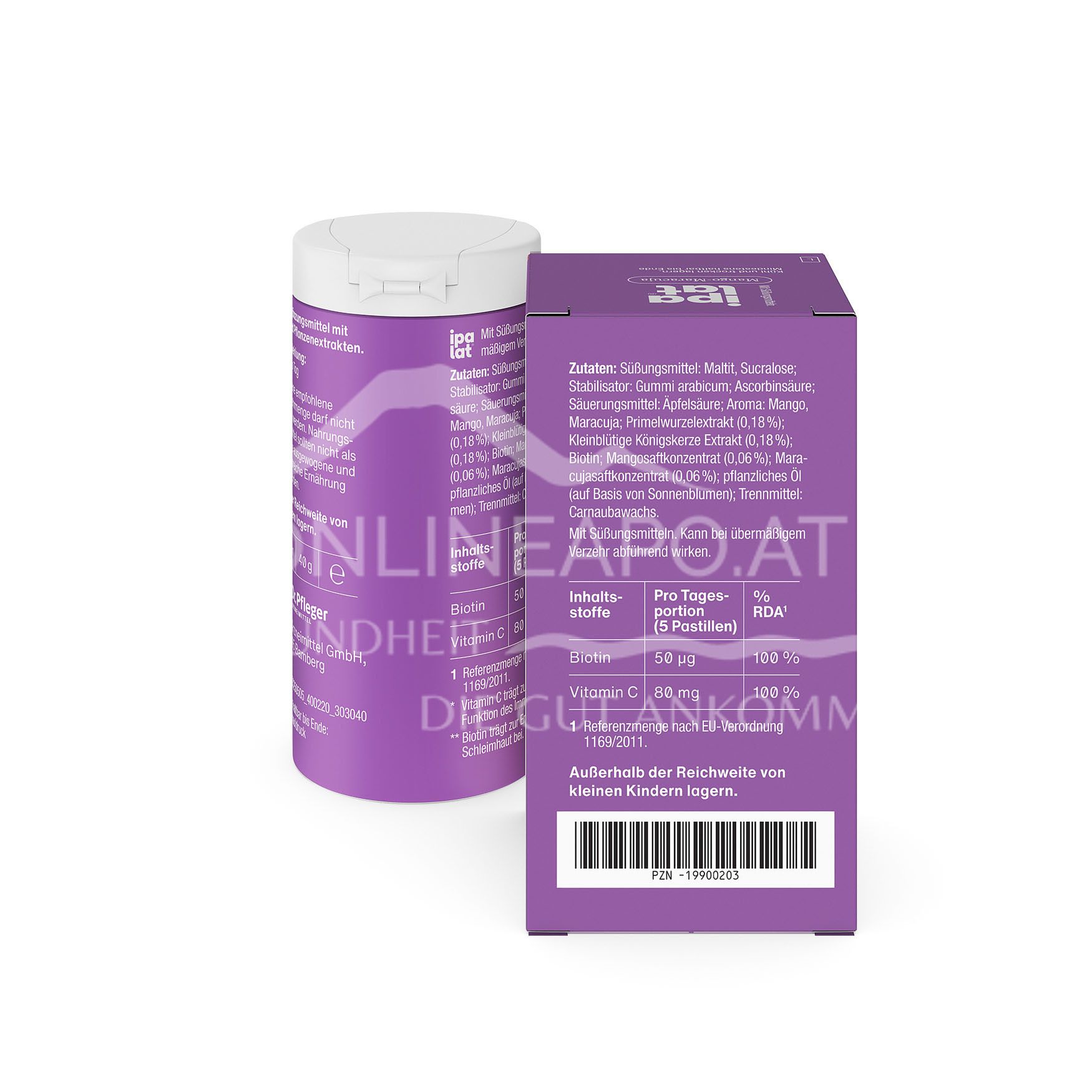 An exotic treat for your defences: ipalat® Mango-Passion Fruit Vitamin Pastille combines vitamin C & biotin with proven primrose root. Supports the immune system and cares for the mucous membranes. Ideal for on the go, lactose-free & gluten-free.