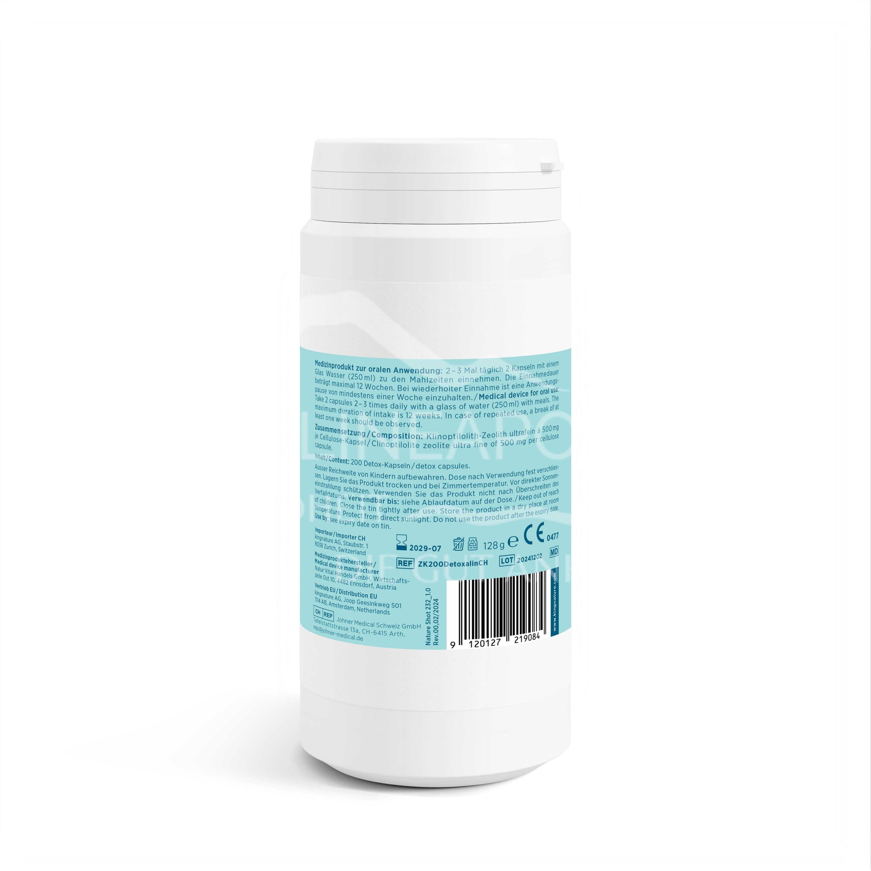 Detoxalin® is a natural medical product. It contains pure volcanic earth (clinoptilolite) and supports the binding and elimination of heavy metals and other harmful substances from the organism. 200 detox capsules with ultra-fine clinoptilolite, net content 128 g.