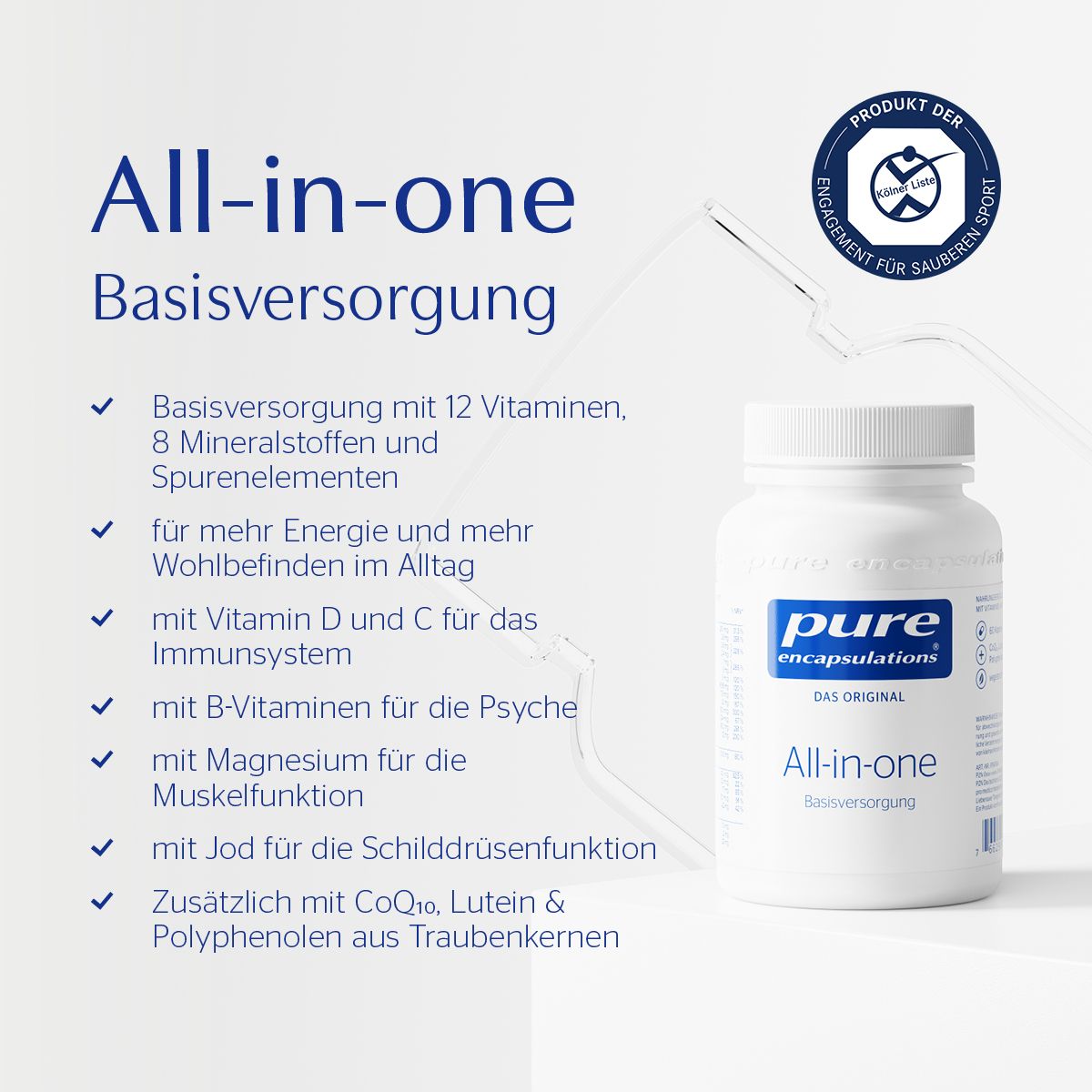 Entdecken Sie Pure Encapsulations® All-in-one für Ihre tägliche Basisversorgung. Die Kapseln bieten einen umfassenden Komplex aus 12 Vitaminen, 8 Mineralstoffen und wertvollen Spurenelementen für das allgemeine Wohlbefinden.