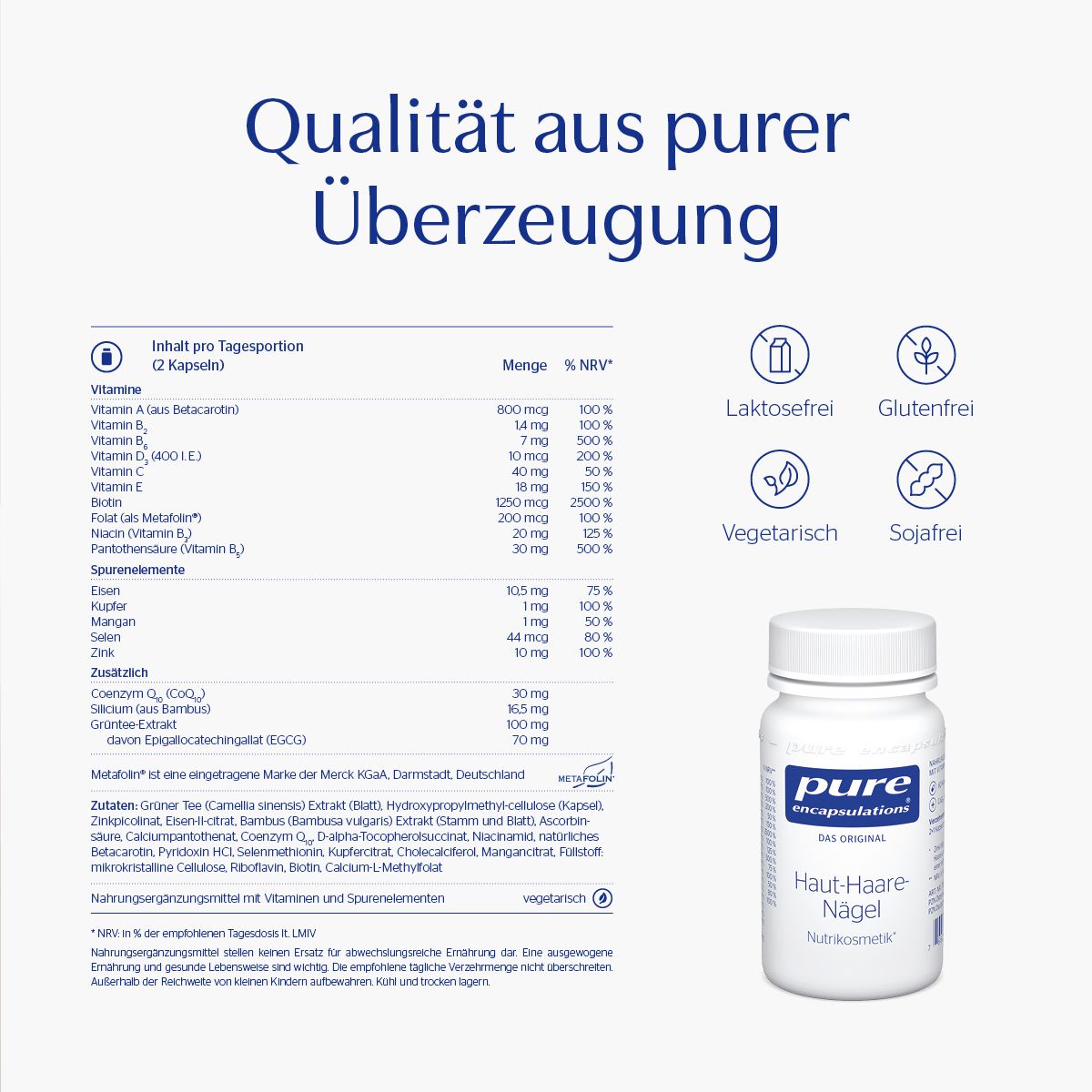 - Die Wissenschafts-Experten von Pure Encapsulations® haben Haut-Haare-Nägel für eine langfristige Anwendung konzipiert. So bietet dir die Rezeptur Nährstoffe in einer angepassten Dosierung für eine ideale Wirkung. Damit deine Zellstrukturen langfristig versorgt sind.