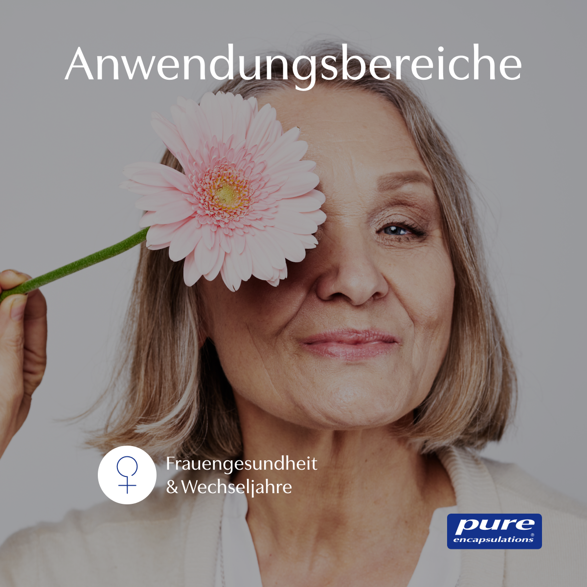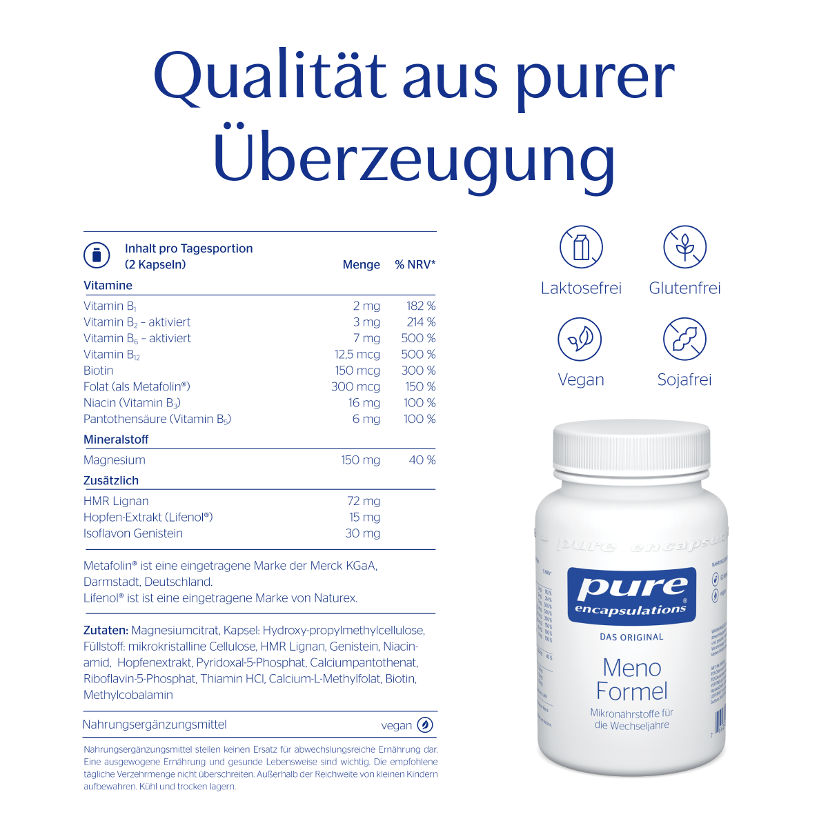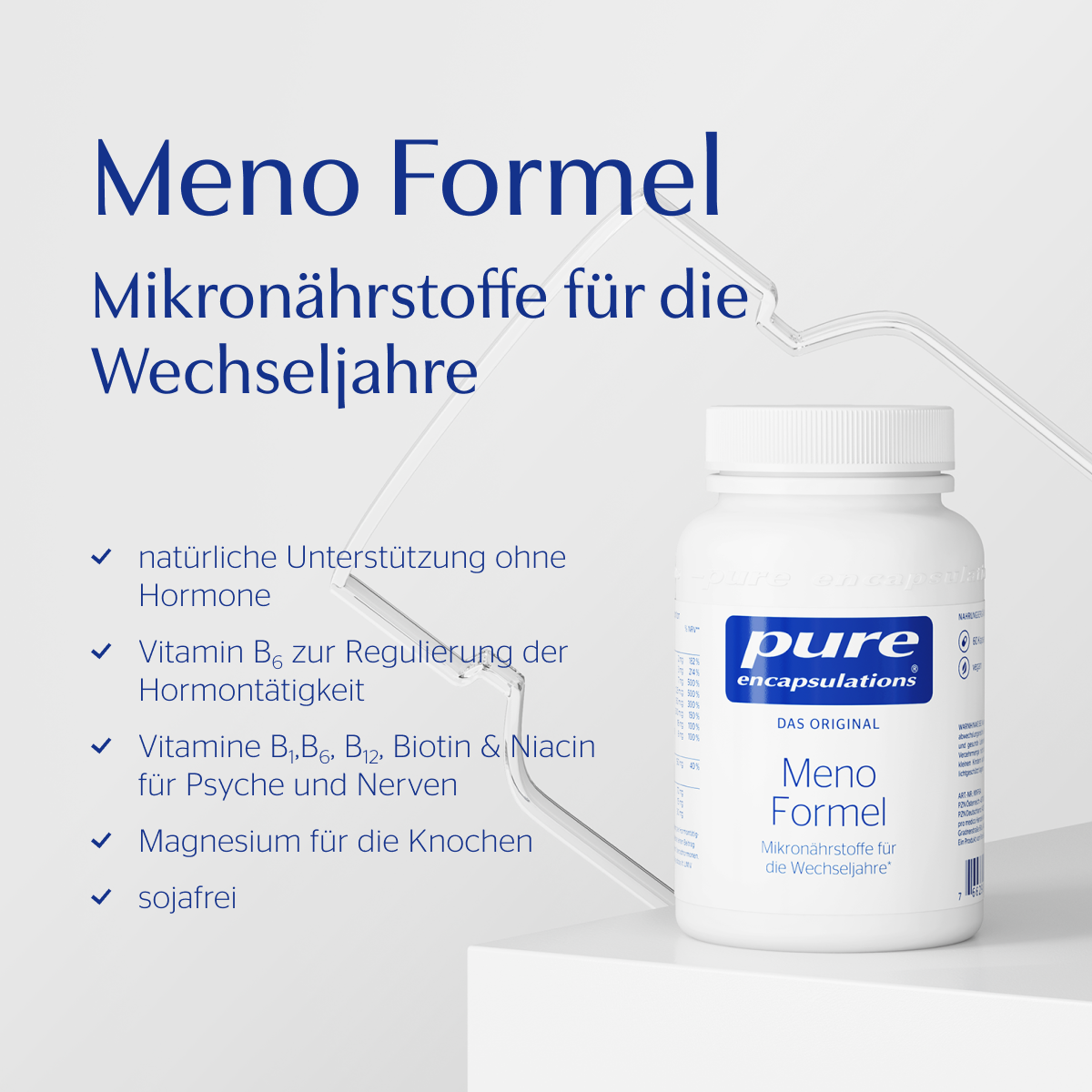 Die pure encapsulations® Meno Formel Kapseln sind ein Nahrungsergänzungsmittel für die Frau in den Wechseljahren. Die Formel trägt durch Vitamin B6 zur Regulierung der Hormontätigkeit, sowie zu einer normalen Funktion von Psyche und Nerven bei.