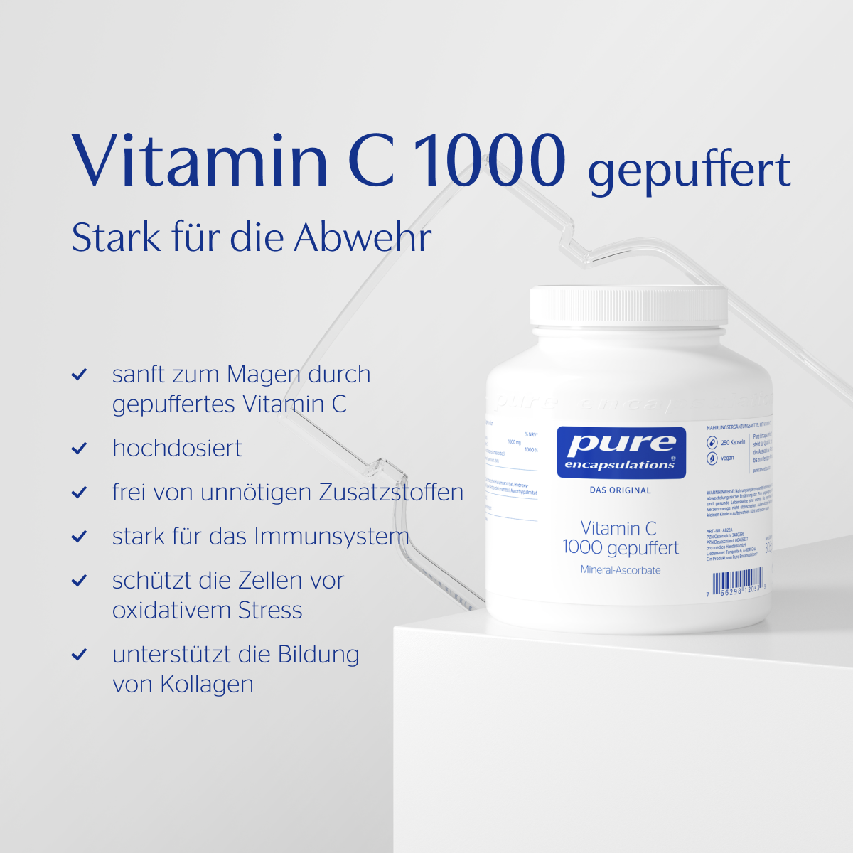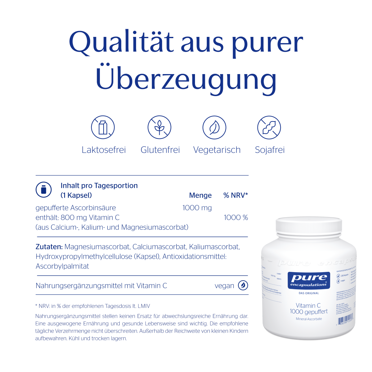 Als magenschonende Version des Mikronährstoffs ist Vitamin C gepuffert von Pure Encapsulations an die basischen Mineralstoffe Kalium, Magnesium und Calcium gebunden. Weil Vitamin C aufgrund des niedrigen pH-Werts bei empfindlicher Verdauung möglicherweise schlecht vertragen wird, schafft diese Kombination ein Gleichgewicht. Denn die Säurebelastung für den Magen wird dadurch reduziert und die gepufferte Variante ist somit besonders verträglich, so dass die Anwendung auch für sensible Menschen geeignet ist.