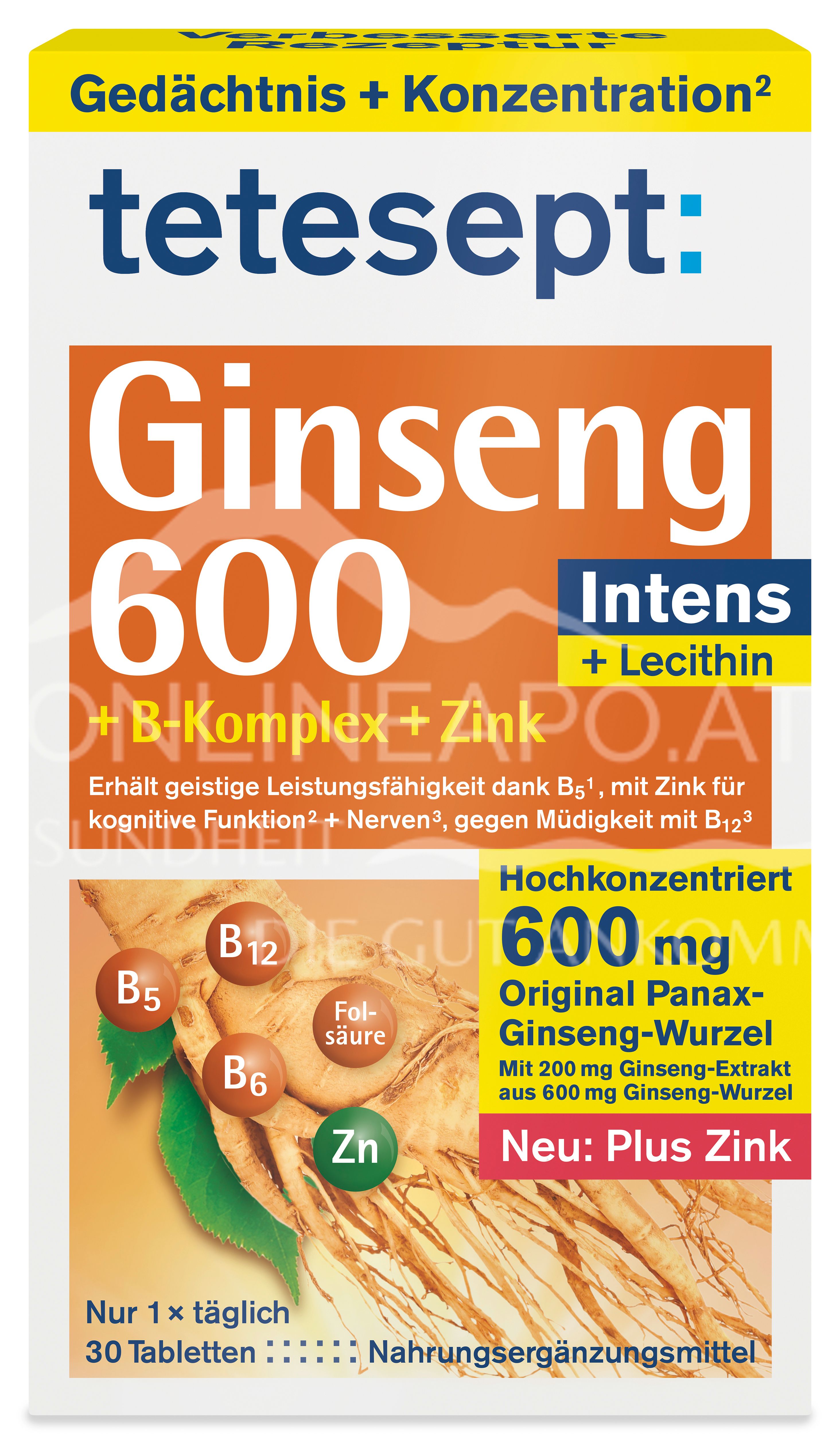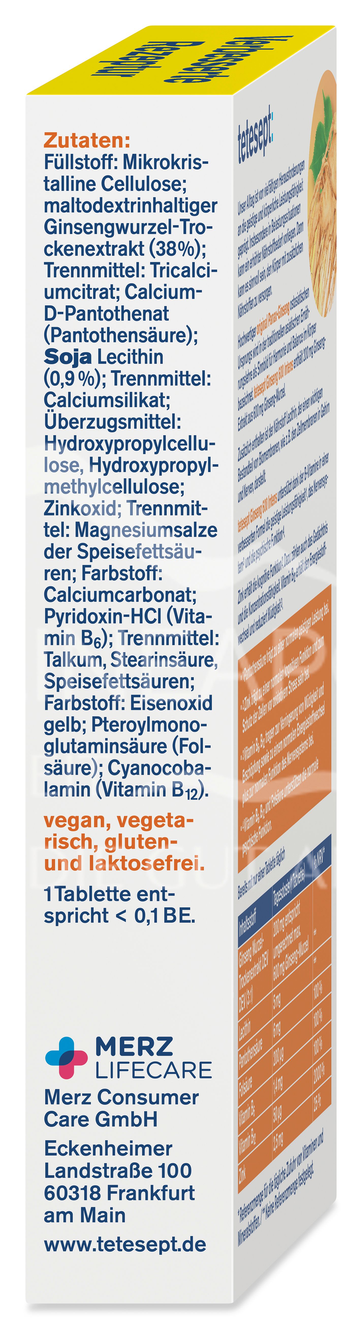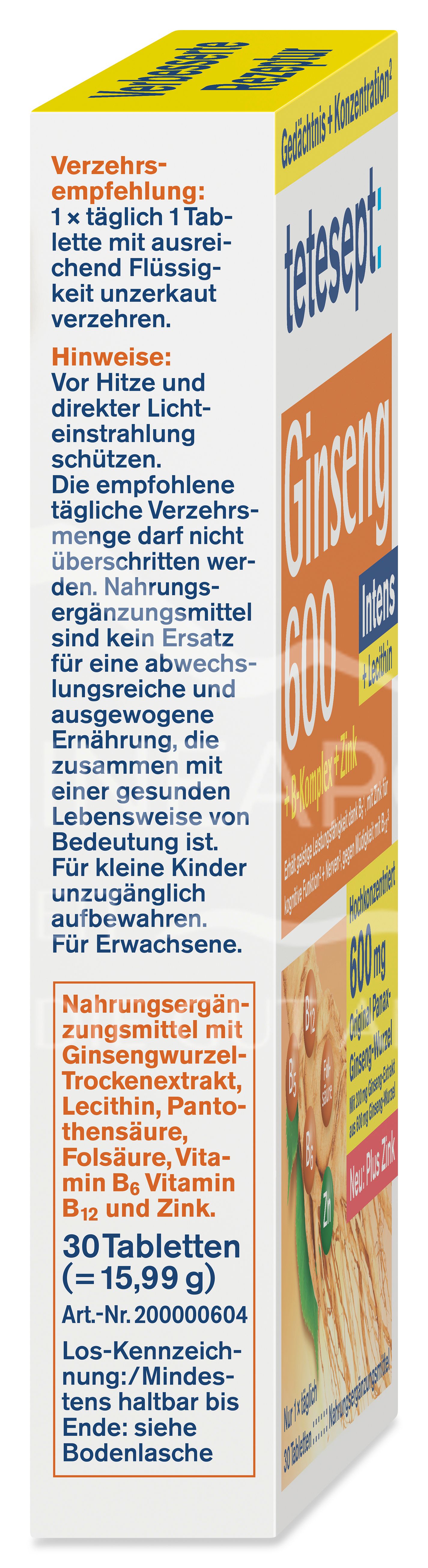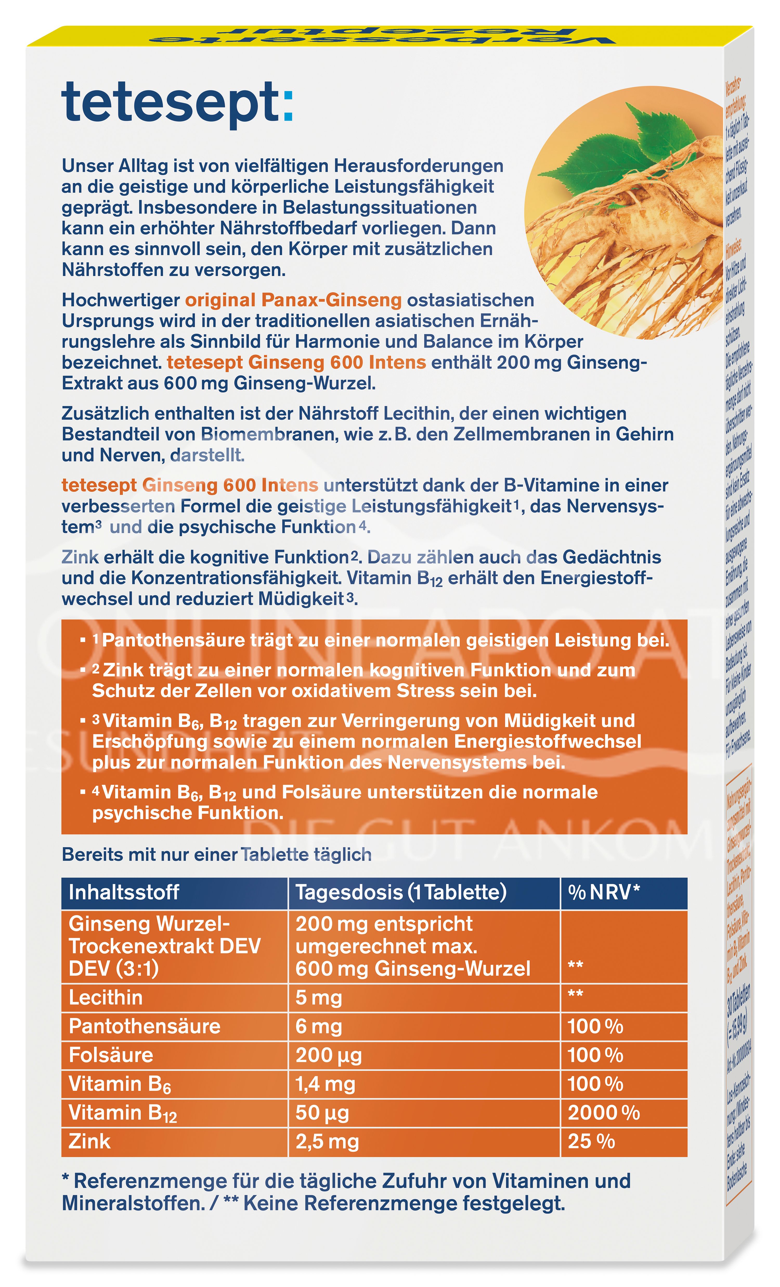 The tetesept Ginseng 600 Intens tablets are a dietary supplement with ginseng root dry extract, lecithin, pantothenic acid, folic acid, vitamin B6, vitamin B12 and zinc.