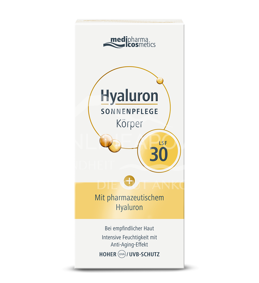 Die medipharma cosmetics Hyaluron Sonnenpflege Körper LSF 30 mit pharmazeutischem Hyaluron schützt, spendet Feuchtigkeit, strafft und festigt die empfindliche Haut. Mit Anti-Aging Effekt und hohem UVA-/UVB-Schutz.