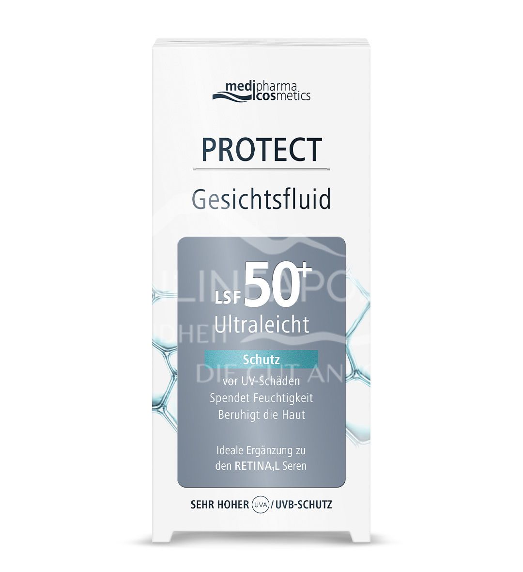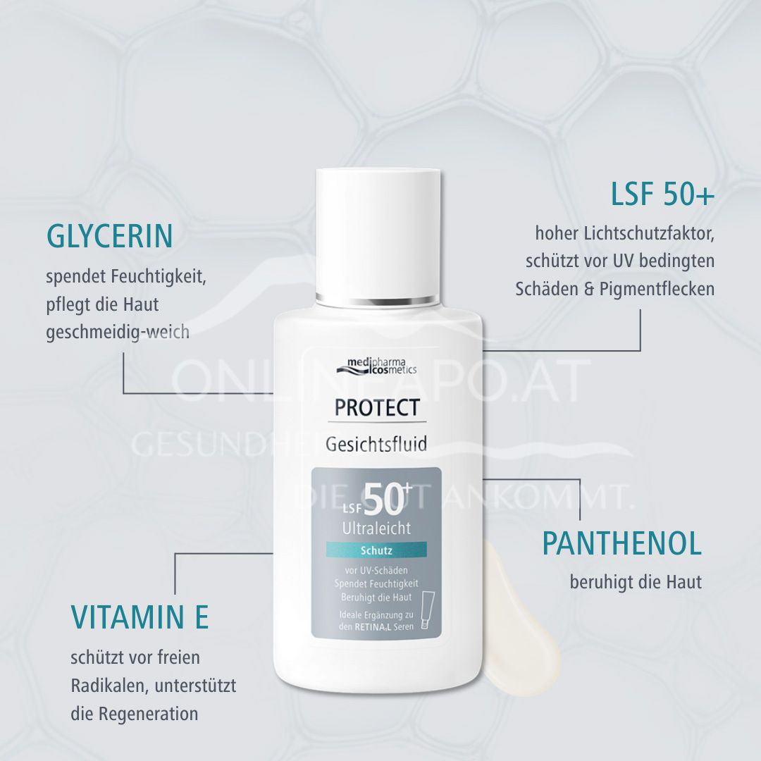 Schützen Sie Ihre Haut täglich mit dem medipharma cosmetics Protect Gesichtsfluid LSF 50+. Dieses leichte Fluid bietet hohen UV-Schutz, zieht schnell ein und hinterlässt ein angenehmes Gefühl. Ideal für den täglichen Gebrauch in Kombination mit RETNA1L.