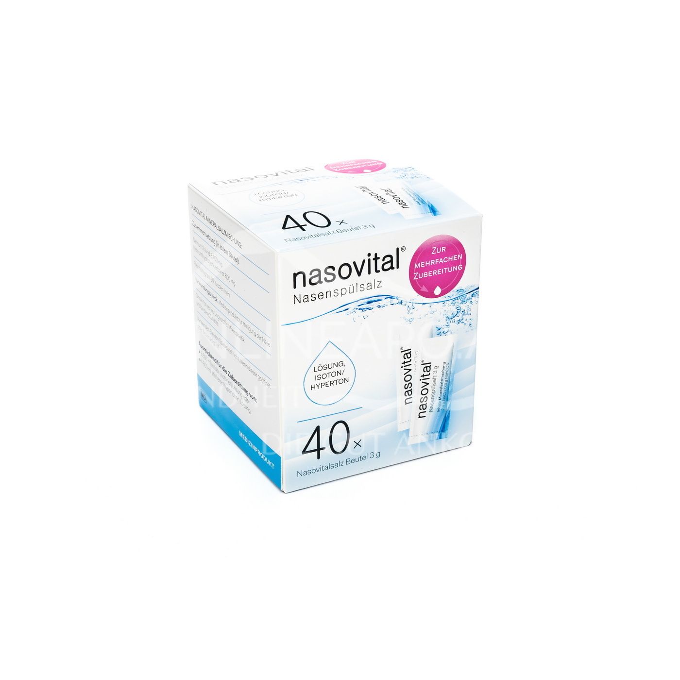 Die Nasovital Nasenspülsalz Box enthält 40 Beutel zu je 3 g des Nasovital Nasenspülsalzes. Hierbei handelt es sich um 80% natürlichen Salz aus den Bergen des österreichischen Salzkammergutes vermischt mit 20% Natriumhydrogencarbonat um die Schleimlösung zu begünstigen und entzündliche Stoffwechselprodukte zu neutralisieren. Die enthaltene Salzmischung eignet sich für alle Anwendungsgebiete und ergibt durch Anpassung der Salzmenge eine isotone (präventiv) oder hypertone (bei bereits verstopfter Nase) Spüllösung.