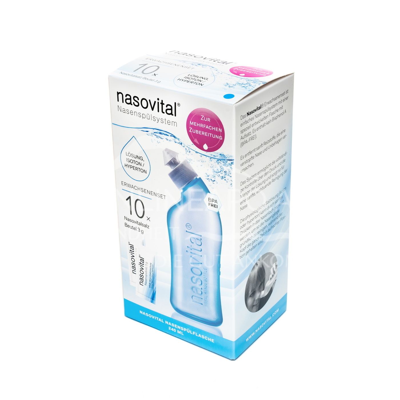 1 x Nasovital Nasenspülsystem (Farbe: Blau oder Rosa) und 10 Beutel zu je 3 g des Nasovital Nasenspülsalzes – mit natürlichem Salz aus den Bergen des österreichischen Salzkammergutes.