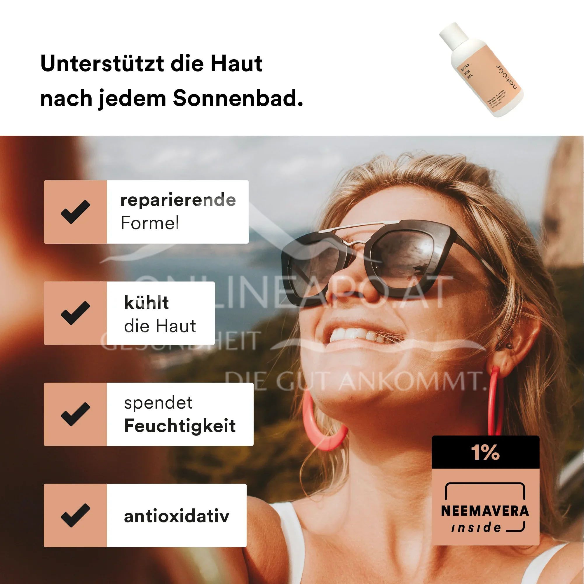 Erlebe natürliche Pflege nach dem Sonnenbad: Das natüür After Sun Gel mit NEEMAVERA, Aloe Vera und Aprikosenöl kühlt sofort, spendet Feuchtigkeit und regeneriert sonnengestresste Haut. Vegan, ohne Parabene & Made in Germany.