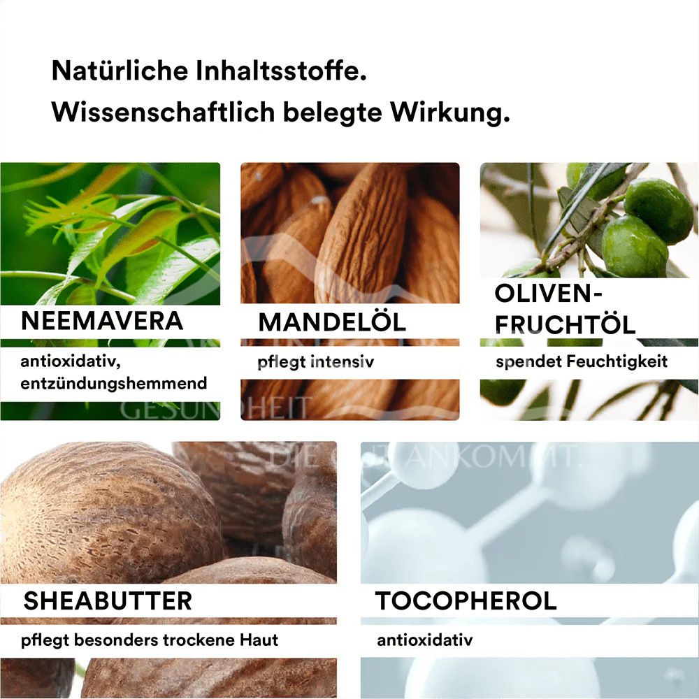 Die natürliche Lösung für extrem trockene & gereizte Hautstellen. Hochkonzentrierter Neemblattextrakt (2,5%) wirkt entzündungshemmend & beruhigend. Ohne Duftstoffe, 100% vegan & Made in Germany. Für ein entspanntes Hautgefühl.