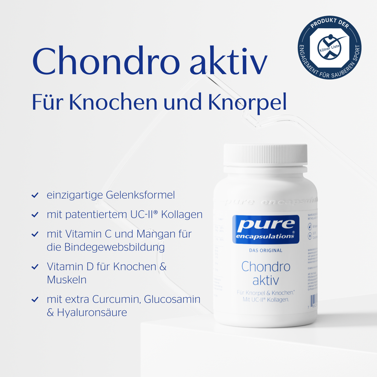 pure encapsulations® Chondro aktiv Kapseln ist ein Nahrungsergänzungsmittel mit innovativem UC-II® Kollagen für gesunde Knorpel und Knochen. Damit Gelenke und ihre enthaltenen Knorpel und Bänder lange gesund bleiben und reibungslos funktionieren können.