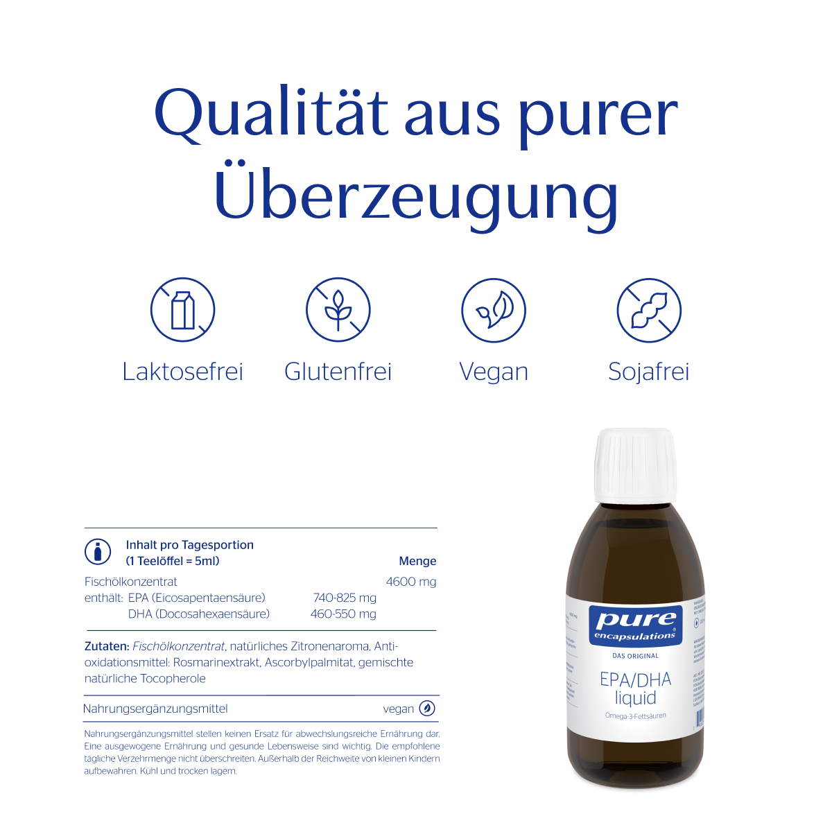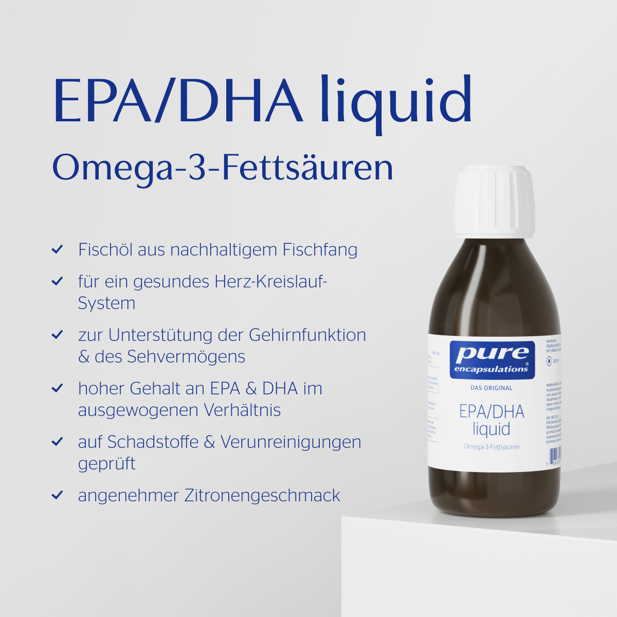EPA/DHA liquid liefert die Omega-3-Fettsäuren EPA (Eicosapentaensäure) und DHA (Docosahexaensäure) in einfach dosierbarer, flüssiger Form. Hoch dosiert und dezent im Geschmack ist das Produkt für all jene geeignet, die Fisch nicht in ausreichender Menge und Regelmäßigkeit auf den Teller bekommen und daher auf Nahrungsergänzungsmittel zurückgreifen möchten.