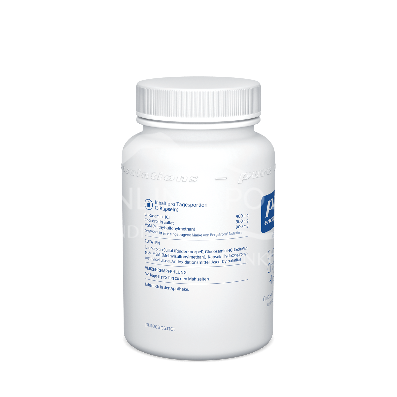 - Zusammensetzung pro Tagesportion (3 Kapseln): Glucosamin HCl 900 mg, Chondroitin-Sulfat 900 mg, MSM (Methylsulfonylmethan) 900 mg. OptiMSM® ist eine eingetragene Marke von Bergstrom® Nutrition.