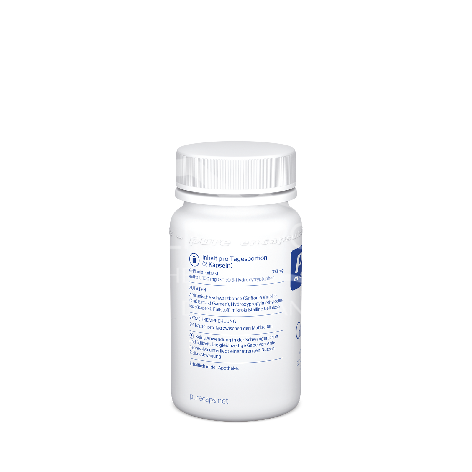 - Zusammensetzung pro Tagesdosis (2 Kapseln): Griffonia-Extrakt 333 mg enthält: 100 mg (30 %) 5-Hydroxytryptophan.
