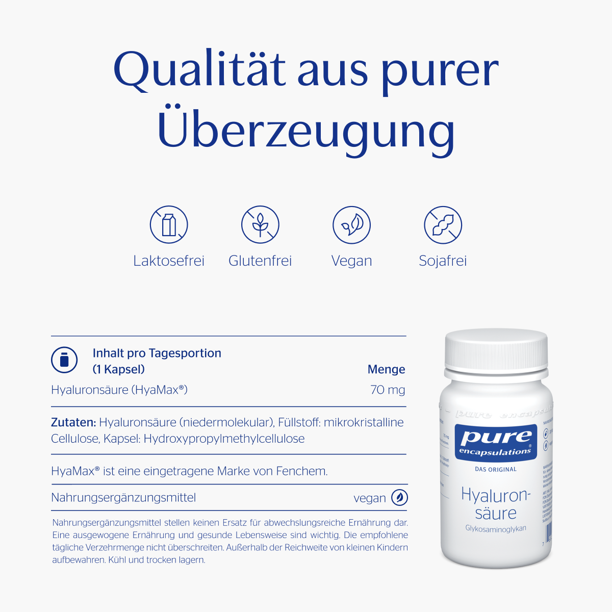 • Inhalt pro Tagesportion (1 Kapsel): Hyaluronsäure (niedermolekular) 70 mg. HyaMax® ist eine eingetragene Marke von Fenchem.