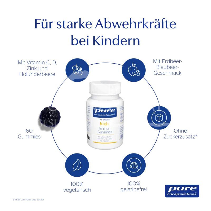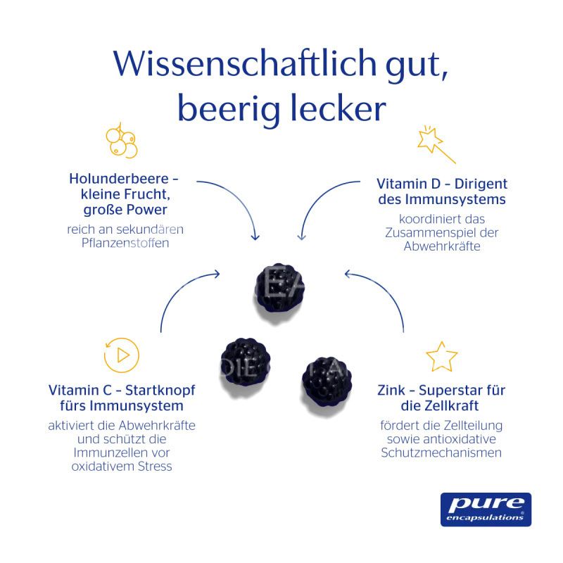 Stärken Sie die Abwehrkräfte Ihres Kindes einfach und lecker! Die pure encapsulations® Kids Immun Gummies sind voller wichtiger Nährstoffe. Vitamin C, D, sowie Zink unterstützen sie ein gesundes Immunsystem - optimal ergänzt mit Holunderbeeren-Extrakt.