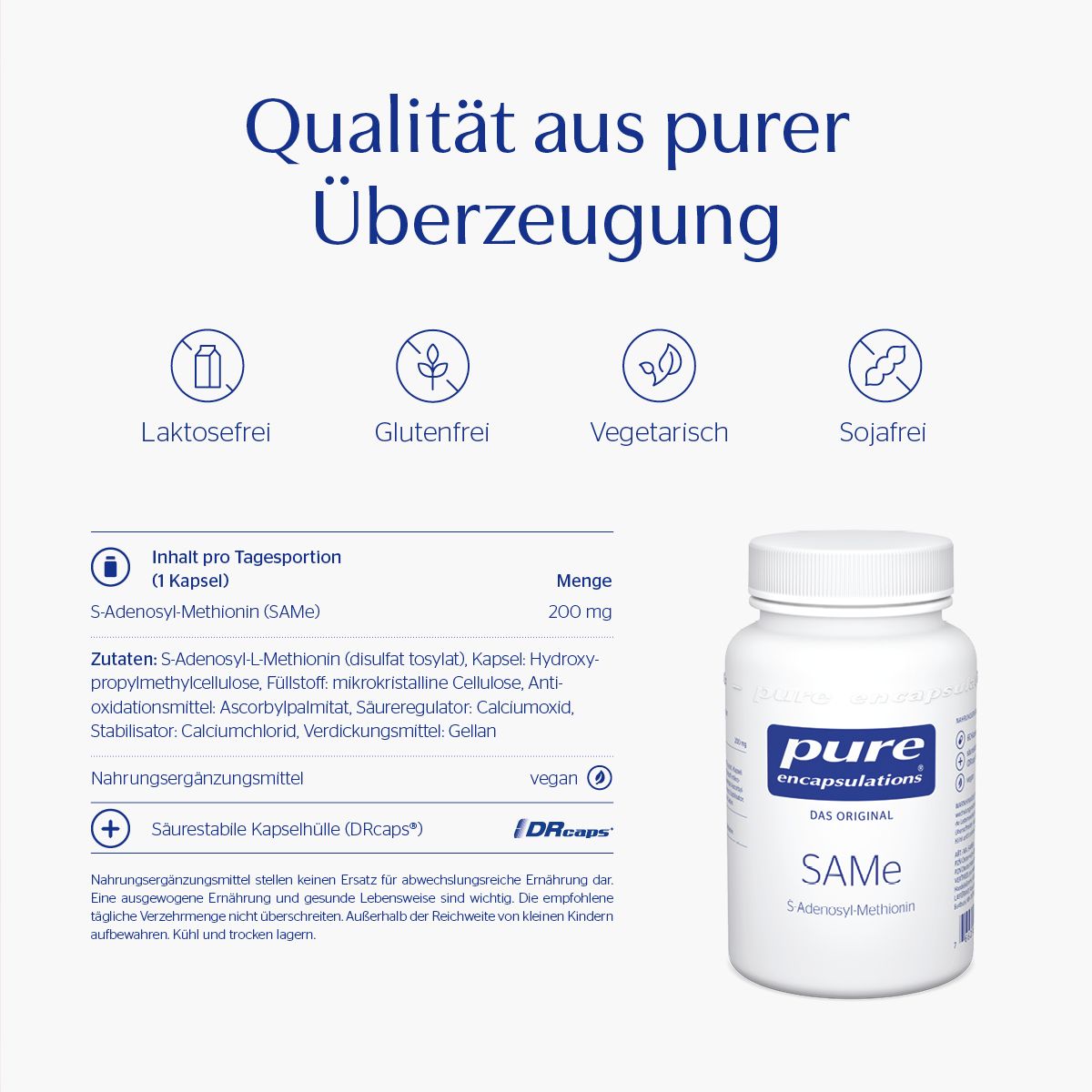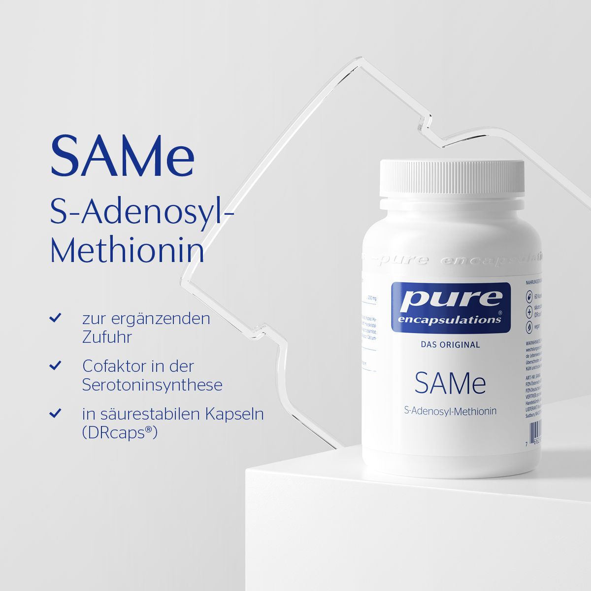 pure encapsulations® SAMe - SAMe ist eine natürlich vorkommende Substanz, welche an zahlreichen Stoffwechselprozessen beteiligt ist. So spielt es im Rahmen des Adrenalin- und Serotoninstoffwechsels sowie als Präkursor von Glutathion eine Rolle.