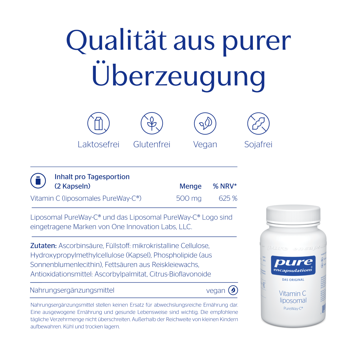 - Zusammensetzung pro Tagesdosis (2 Kapseln) %NRV**: Vitamin C (liposomales PureWay-C®) 500 mg 625 %. Liposomal PureWay-C® und das Liposomal PureWay-C® Logo sind eingetragene Marken von One Innovation Labs, LLC. ** NRV: in % der empfohlenen Tagesdosis lt. LMIV.