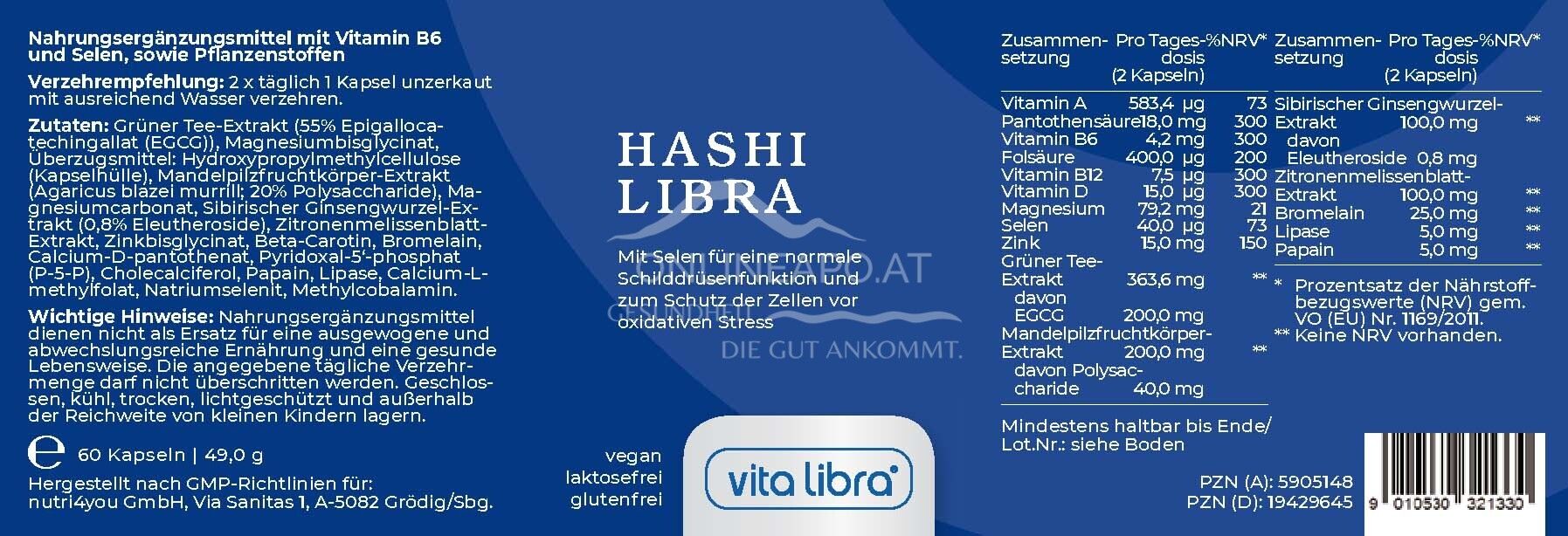 Die vita libra Hashi Libra Kapseln sind ein Nahrungsergänzungsmittel Vitamin B6 und Selen, sowie wertvollen Pflanzenstoffen. Ihr Nährstoffkomplex für eine normale Schilddrüsenfunktion.